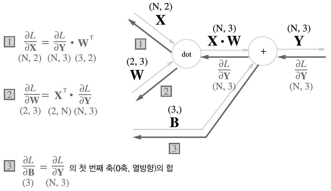 결과만 보자면 X에 대한 편미분을 알고 싶다면 앞에서 넘어온 값과 가중치 행렬의 전치 행렬을 내적 해주면 되고,