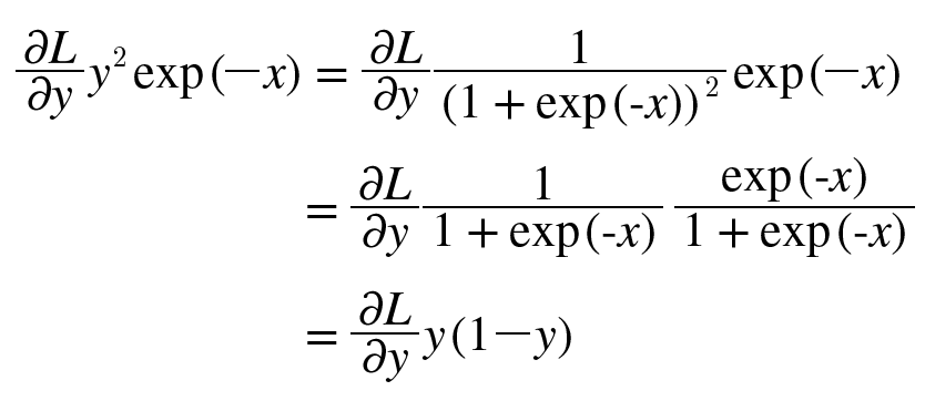 1/x를 미분하면 -1/x^2이고 x가 1+exp(-x)이므로 -y^2이다.