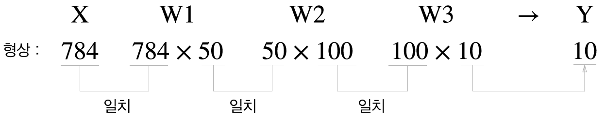 이유는 행렬 내적을 사용하고 난 후 형상의 순서가 조금 바뀌기 때문이다.