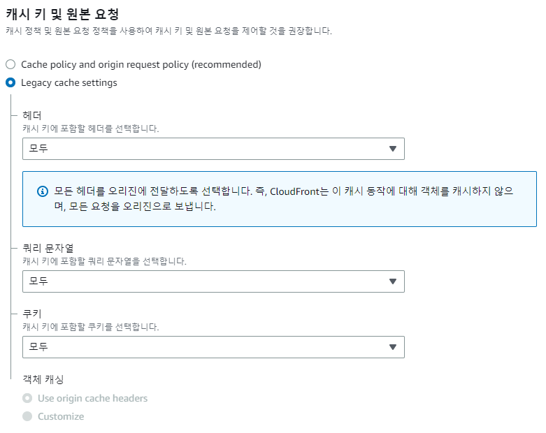 꼭 Legacy cache settings를 선택하고 헤더, 쿼리 문자열, 쿠키 전부 모두로 선택하자.