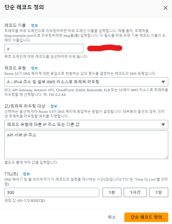먼저 api.example.com 주소를 API 서버 주소로 사용하고 싶다면 Route53 에서 다음과 같이 설정해 주어야 한다.