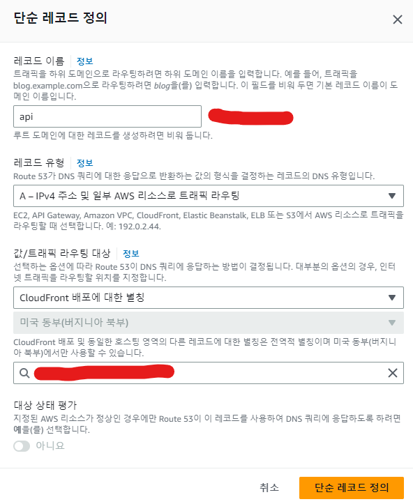 api.example.com 을 방금 만든 CloudFront 배포에 대한 별칭으로 이동하게 한 후 생성하면 된다.